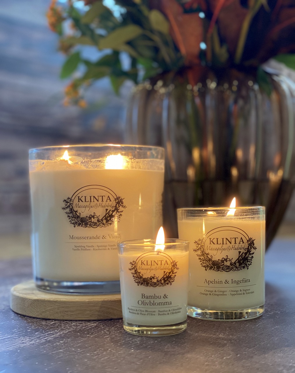 Klinta Massageljus är helt vegetabiliska och giftfria ljus med den extra bonusen att de är massageljus som kan användas på hela kroppen. Den vegetabiliska basen har blandats med aromoljor av högsta kvalitet och tappats i återvunnet glas. Alla Klintas produkter genomgår en hög kvalitetskontroll för att säkerställa rättvisa och älskade produkter.