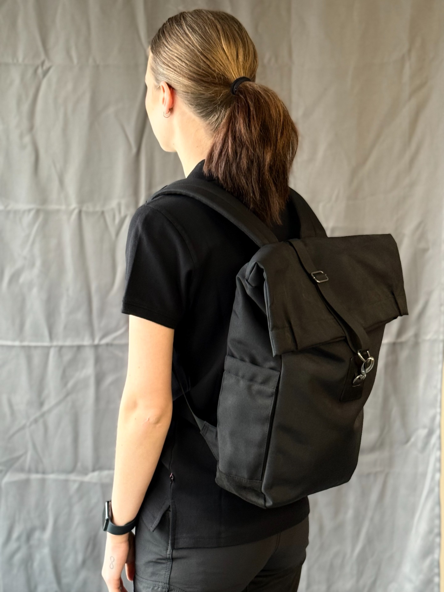 Smart och praktiskt ryggsäck i fin återvunnen canvas-kvalitet med roll-top och magnetstägning. Stor öppning för huvudfacket med datorficka (15,6").
