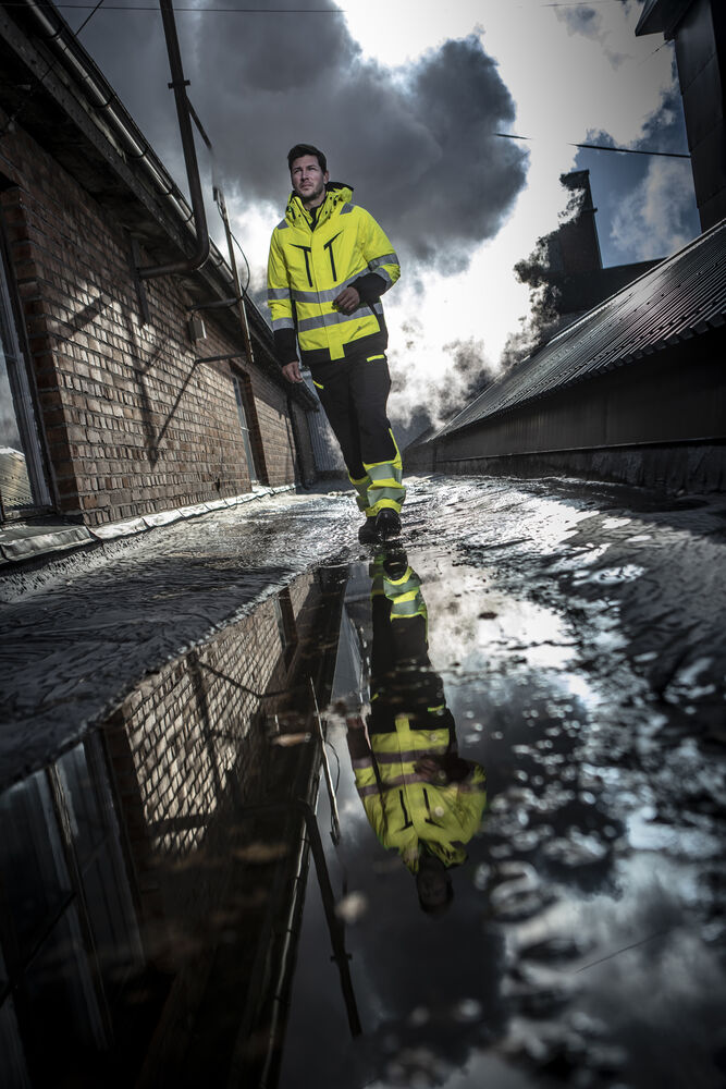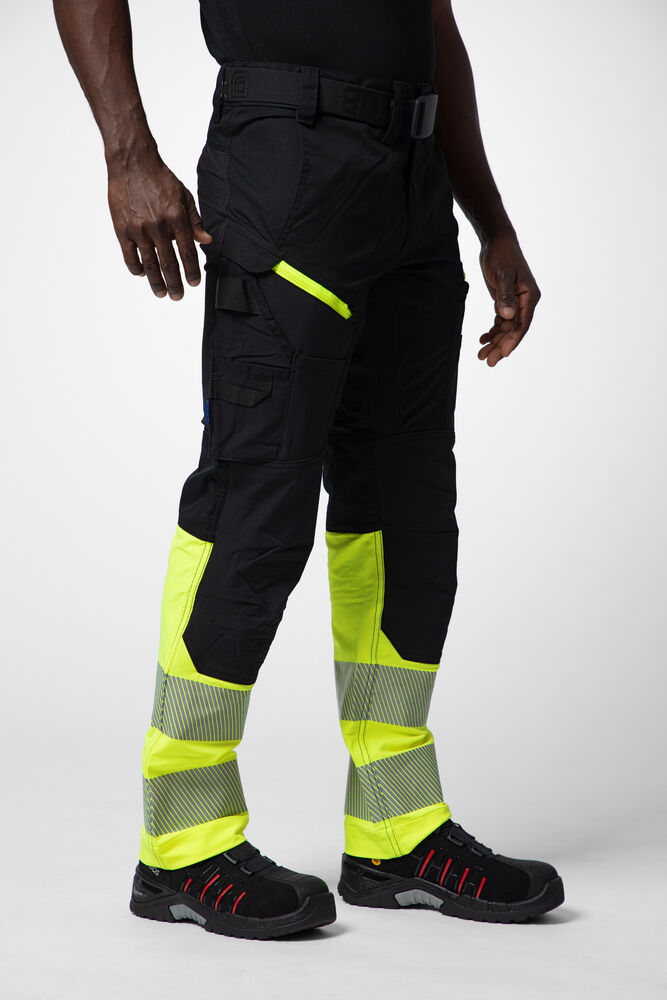 Servicebyxa i full stretch för optimal rörelsefrihet och passform. Benfickor med dragkedja, den vänstra med invändig mobilficka och den högra med hållare för ID-kort. På höger sida finns även tumstocks- och verktygsficka med knivknapp. Ventilationskanaler på utsida ben. Bredare bälteshälla baktill för att undvika tryck från bälte vid ryggslut. Dolda fästen för hängfickor i linningen (ref. art 9042). Knäskyddsfickor som går att reglera i två höjder, öppning inifrån.