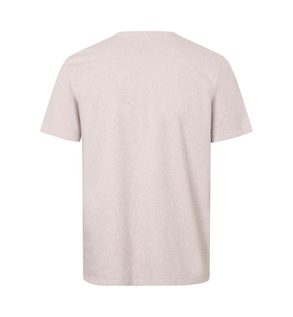 Tidlös T-shirt tillverkad av garn som innehåller 20 % fiber från återvunnet textilavfall från hushåll i hela Danmark. Det mångfärgade textilavfallet framstår som dämpat i det melerade uttrycket. T-shirten är ofärgad och har rund hals, fyra-lagers ribbstickning i halsen och förstärkning med hals- och axelband.